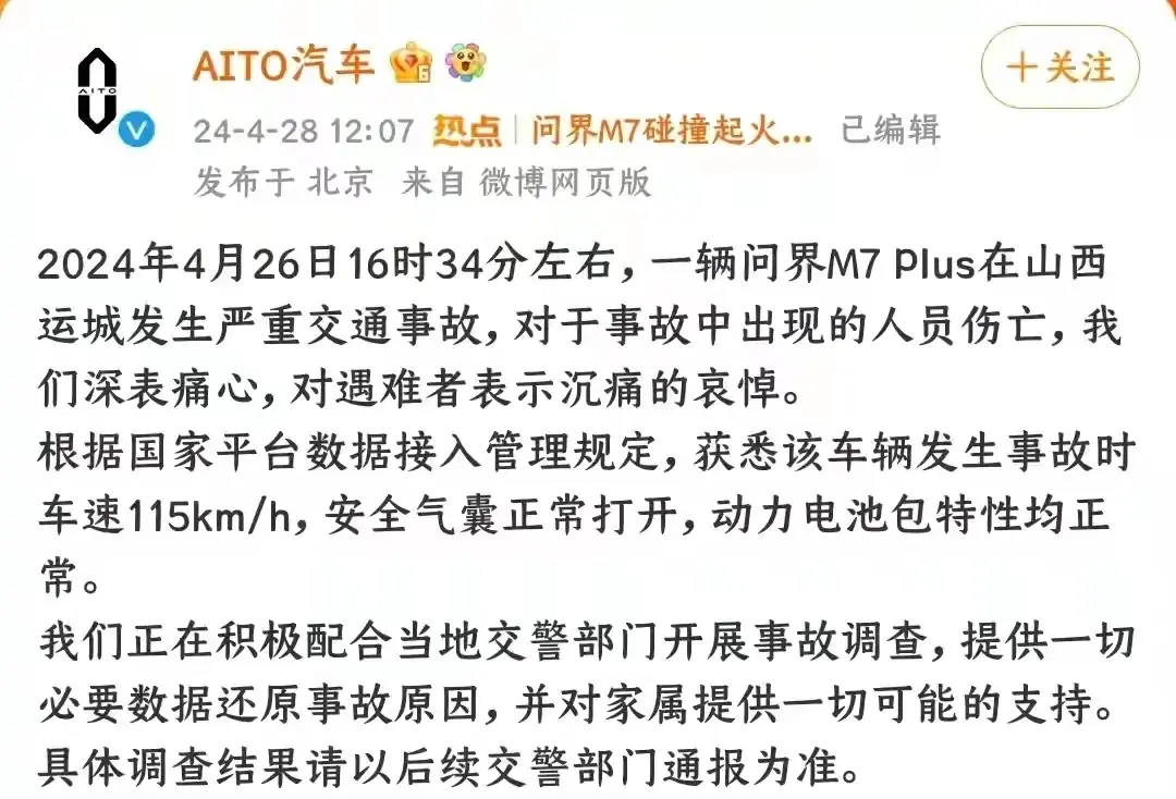 4月28日,AITO发布声明,辟谣车辆发生事故时安全气囊正常打开,动力电池包特性正常,发生事故时车速115KM千米每小时。