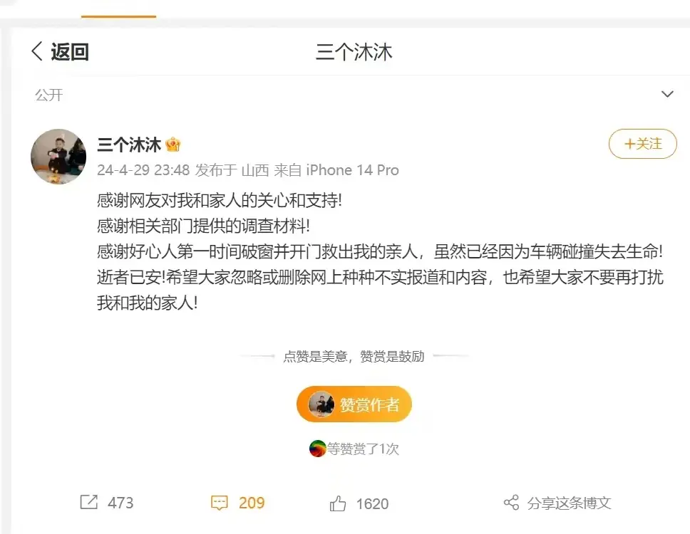4月29日,事故家属发布微博表示:有关部门向其提供了调查材料,本次事故是由于车辆碰撞导致其亲人失去了生命,并呼吁大家删除不实报道和内容。