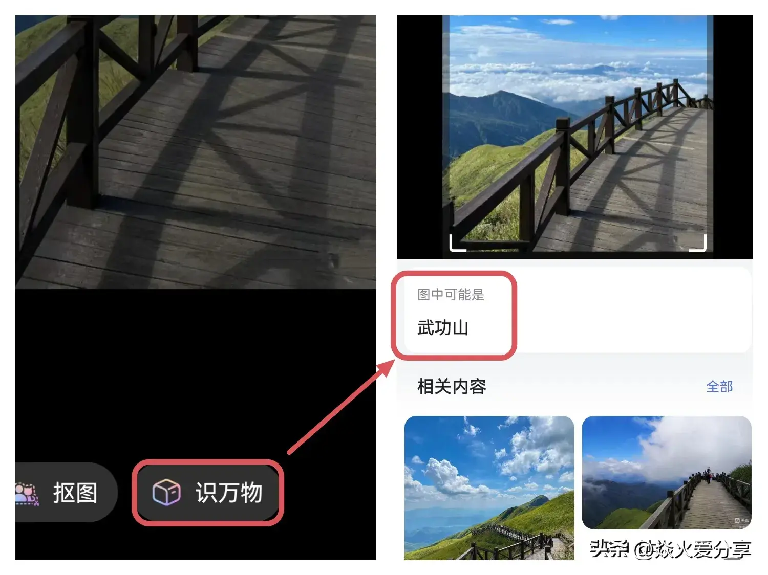 也可以双指长按1秒钟,选择下方的“识万物”,然后你们看下图,这里就能识别出景区了,同时点击进入以后,还可以了解这个景点相关的内容。