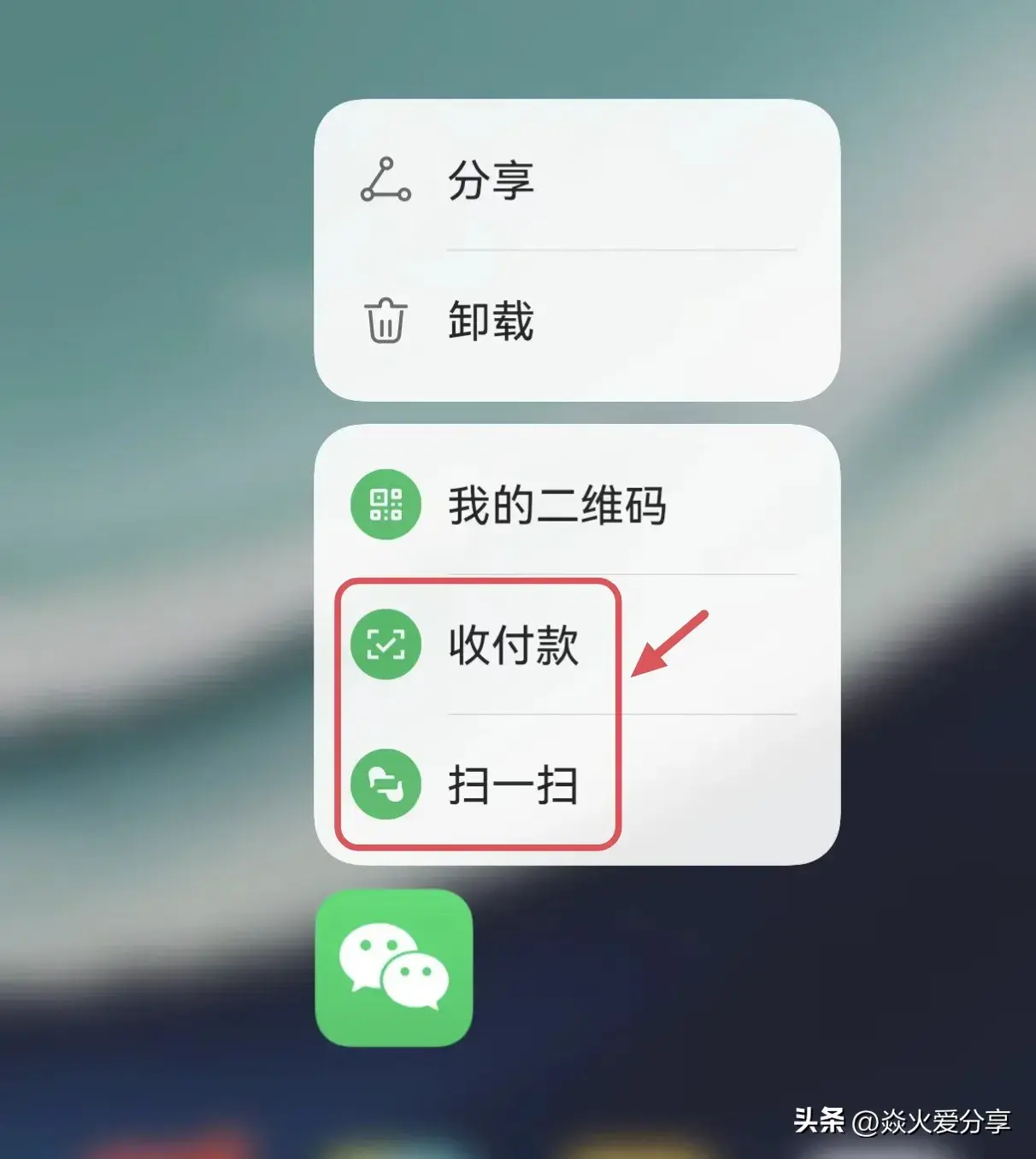 比如说微信这一项,当我长按它,就可以弹出“扫一扫”和“收付款”等快捷方式。