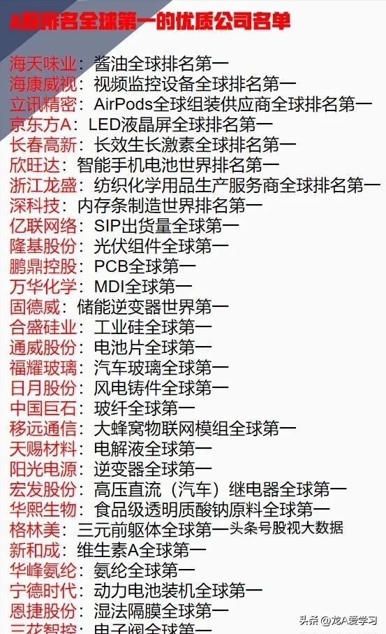 全球第一的优质公司名单:内存条制造世界排名第一,动力电池装机全球第一等。