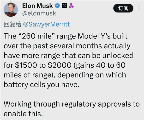 他透露,用户可通过支付1500至2000美元的费用,解锁额外的40至60英里续航里程,具体费用取决于所使用的电池型号。