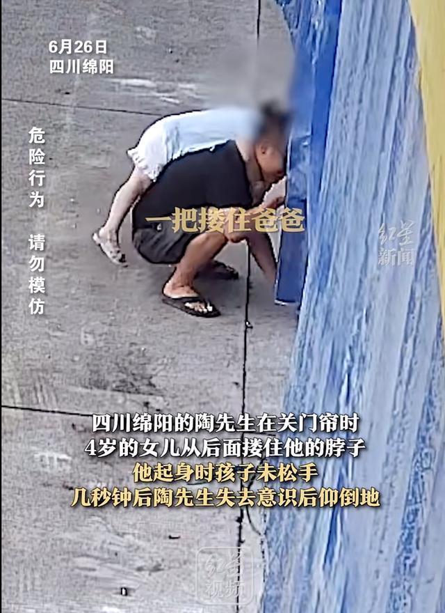 6月26日,四川绵阳。陶先生在关门帘时,4岁的女儿从后面搂住他的脖子,他起身时孩子未松手,几秒钟后陶先生失去意识后仰倒地。陶先生表示,刚好勒住颈动脉窦,听到女儿哭声后醒来,他们第一时间去医院做了检查,现在已经没事了,发视频是为提醒大家这样很危险,不要模仿。