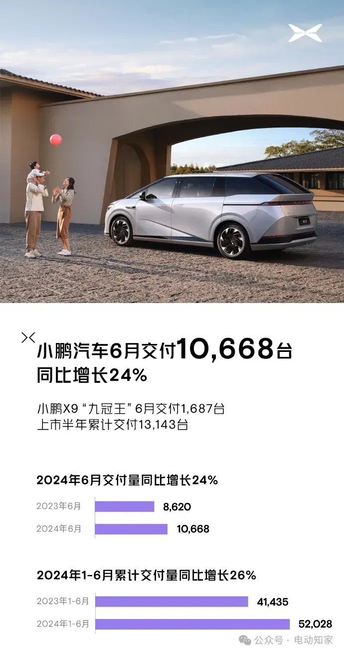 根据最新的交付数据,小鹏汽车在2024年6月共交付了10,668台新车,较去年同期增长24%,环比增长5%。其中,“九冠王”车型小鹏X9的交付量为1,687台,这使得其上市半年后的累计交付量达到了13,143台,在纯电MPV和纯电三排座车型市场中继续保持领先地位。截至2024年6月,小鹏汽车已经累计交付了52,028台新车,同比增长26%。