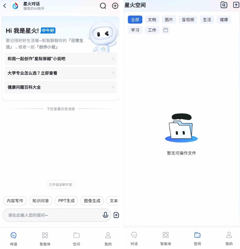 基于此,讯飞星火APP及桌面版全新升级改版,率先发布“个人空间”,用户可以上传自己的工作、学习、生活、健康等各类资料,形成每个人的专属知识库,再结合人设,让大模型生成更个性化内容。此外,讯飞星火首批上线14个智能体,面向特定场景打造专属助手。