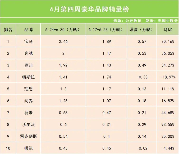 6月最后一周,国内豪华品牌销量排行榜发生了变化。奔驰以2万辆的销售量,环比增长36.05%成为销量增长最高的品牌。宝马销售2.46万辆,环比大涨30%,终端优惠也回调了,让用户尽快提车的效果不错。奥迪销售1.92万辆,环比增长34.27%,排名第三。
