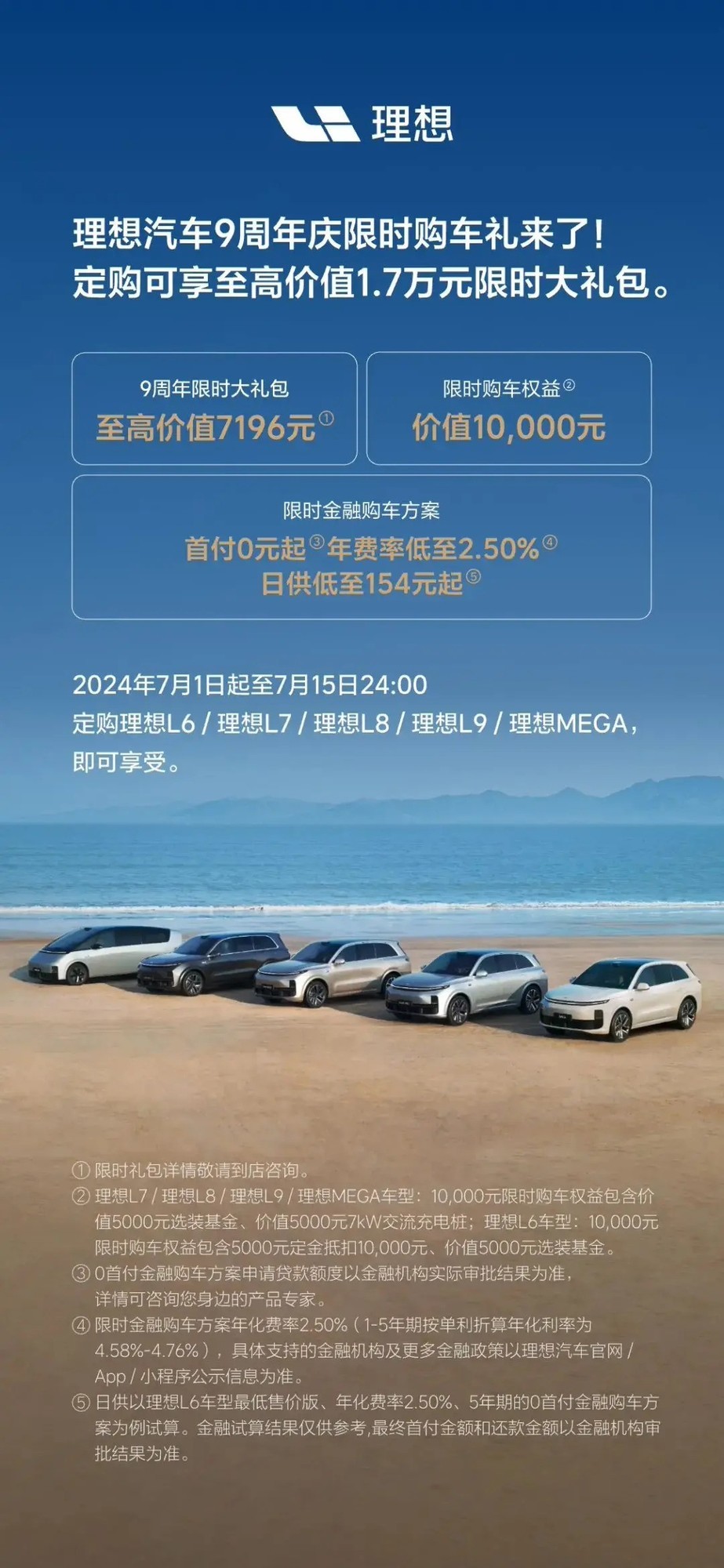 此外,消费者还可以选择低至2.5%年费率的日供计划,并首付仅需起即可获得理想汽车。此次活动时间为2024年7月1日至7月15日24:O,适用于所有理想的车型。
