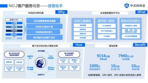 为此中关村科金研发了全场景接警助手平台,提供从底层反诈大模型接入,到上层应用工具一站式服务,目前已为全国9家省级公安、100多家地市公安和200多家区县公安提供服务。