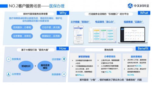 中关村科金基于大模型打造“医保大脑”,群众可以通过文本咨询医保流程,使用语音连接智能客服咨询办理网点、流程、材料等,接通视频客服办理赔付、面签等业务。