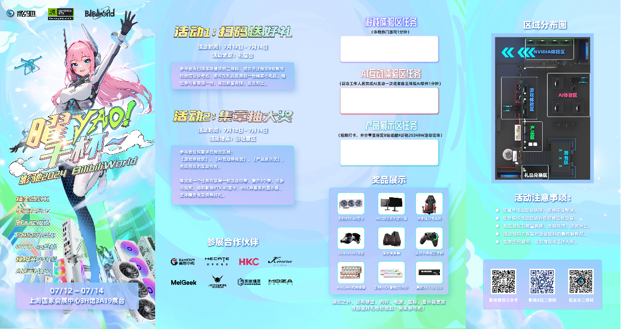 到场即赠纸质版逛展指南,助您轻松规划参展路线,小伙伴可以通过扫码领取伴手礼,也可以通过集章抽取影驰RTX40显卡、HKC显示器,键盘,电竞椅、gai手柄、音响耳机,星曜存储等等好礼。