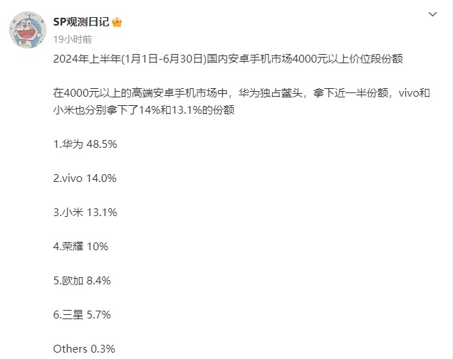 转载:https://mobile.zol.com.cn/883/8834468.html 2024-07-11 16:57:42·[??中关村在线 原创??]·作者:某吃瓜群众 小米14(8GB/256GB) 电商报价 京东商城¥3599本地商家¥3999 近日,知名博主在微博上公布了2024年上半年(1月1日-6月30日)国内安卓手机市场4000元以上价位段份额,其中包含了华为手机的数据。1.华为 48.5%2.vivo 14.0%3.小米 13.1%4.荣耀 10%5.欧加 8.4%6.三星 5.7%Others 0.3% 小米 14 8GB+256GB 黑色[经销商]?京东商城[产品售价]?¥ 3663元 相关论坛 相关广告