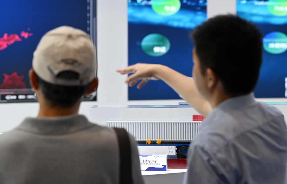 7月11日,与会者在博览会上了解自动导引车的应用情况。新华社记者李然摄