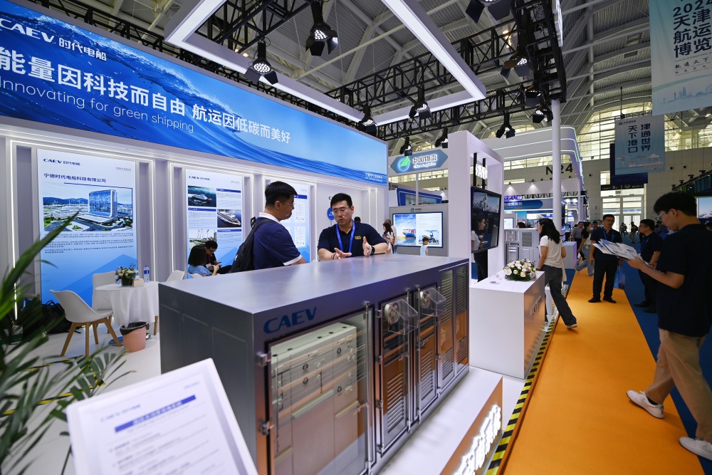7月11日,与会者在博览会上参观电动集装箱船的模型。新华社记者李然摄