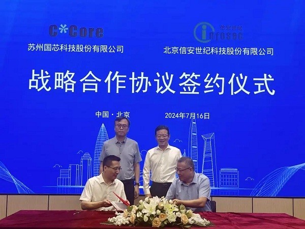 7月16日,北京信安世纪科技股份有限公司(以下简称“信安世纪”,股票代码:688201) 与苏州国芯科技股份有限公司(以下简称“国芯科技”,股票代码688262)在北京正式签署战略合作协议,信安世纪董事长李伟、高级副总裁张庆勇,国芯科技总经理肖佐楠、副总经理艾方等领导出席签约仪式。