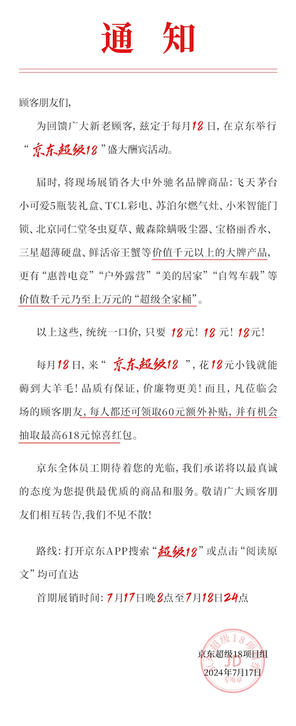 7月17日,京东宣布将推出每月18日的“京东超级18”活动。在此次活动中,消费者只需花费18元即可购买价值千元以上的品牌产品。这些产品包括飞天茅台小可爱5瓶装礼盒、TCL彩电、苏泊尔燃气灶、小米智能门锁、北京同仁堂冬虫夏草、戴森除螨吸尘器、宝格丽香水、三星超薄硬盘和鲜活帝王蟹等。此外,还有价值数千元乃至上万元的“超级全家桶”(如惠普电竞设备、户外露营用品和美的居家用品等),也只需要18元!消费者还可以领取60元额外补贴,并有机会获得最高618元的惊喜红包。首次活动将于今晚20点开始,持续到明晚24点。