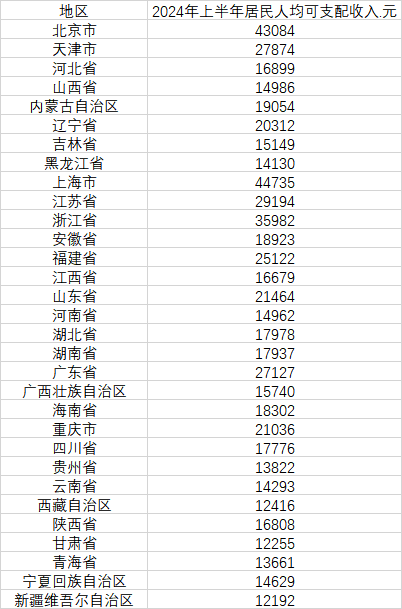 国家统计局网站公布了31个省份2024年上半年居民人均可支配收入情况。数据显示,今年上半年,有10个省份居民人均可支配收入超过了两万元。