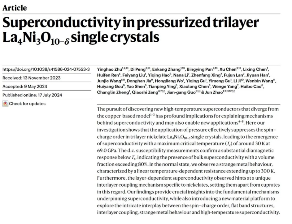 北京时间7月17日晚,复旦大学物理学系赵俊教授团队的研究成果以“Superconductivity in pressurized trilayer La4Ni3O10-δ single crystals”为题发表于最新一期的《自然》(Nature)。