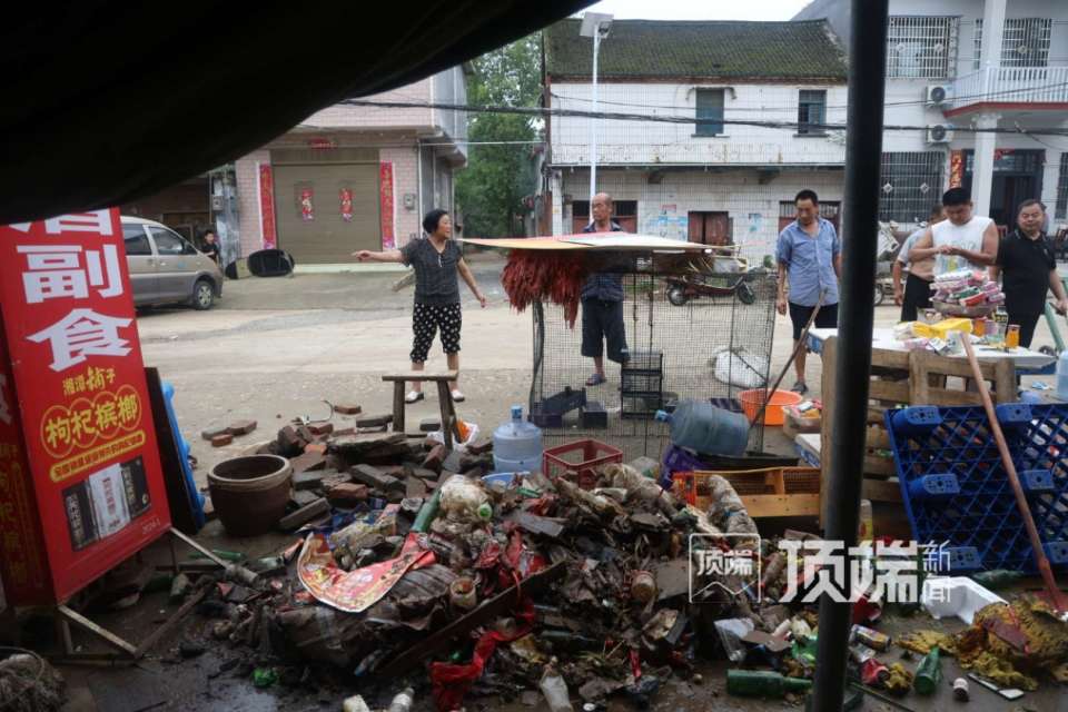 7月17日,社旗县迎来了降雨后的第一个晴天,路面上已经少有积水。顶端新闻记者来到社旗县青台村,沿路街边小店的店家,有的在清理门前的淤泥,有的村民在晾晒粮食,也有几人坐在家门口,谈洪水的惊险和凶猛。