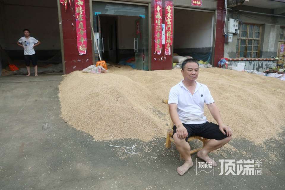 有村民在自家门前,晾晒被水浸泡后的小麦