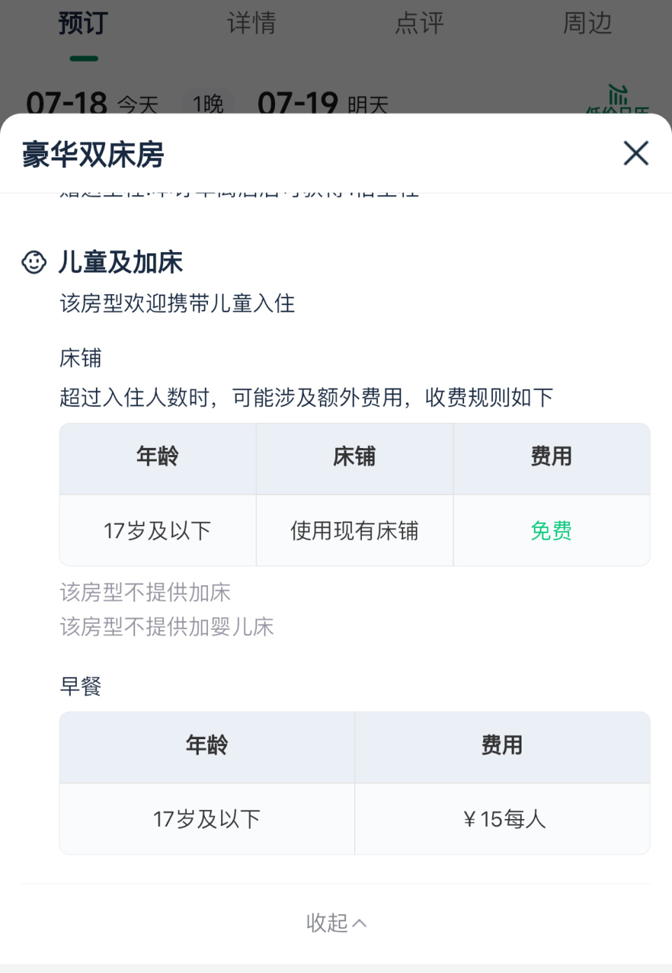 中新经纬注意到,多数房型会备注“该房型欢迎携带儿童入住”,且17岁及以下人员不收费,但仅限使用现有床铺。至于超出的成年人如何收费,酒店并未在平台上进行标注。