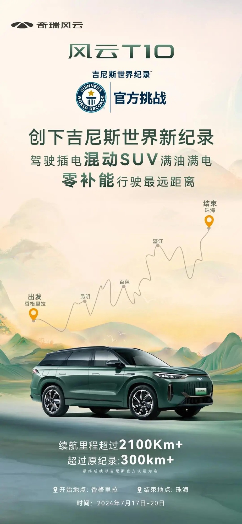 奇瑞汽车最新款车型风云 T10 创造了新的吉尼斯世界纪录。这款新车满油满电零补能行驶最远距离,达到了超过 2100km 的续航里程。该车在 7月17日至20日期间从香格里拉出发,途经昆明、百色和湛江,最终抵达珠海。
