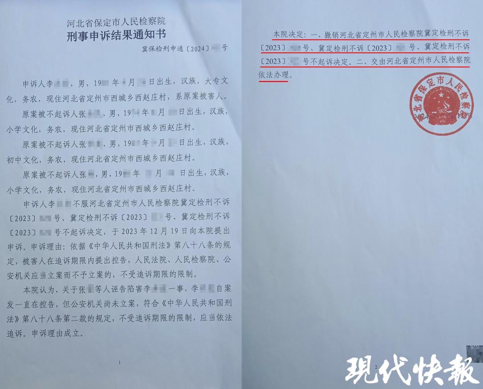 据了解,该案中,与张某一同被移送至检察机关,进行审查起诉的另外三人,被定州市人民检察院作出不起诉决定后,李先生向保定市人民检察院提起了申诉。2024年7月11日,保定市人民检察院在《刑事申诉结果通知书》中明确:“本院认为,关于张*等人诬告陷害李**一事,李**自案发一直在控告,但公安机关尚未立案,符合《中华人民共和国刑法》第八十八条第二款的规定,不受追诉期限的限制,应当依法追诉。”