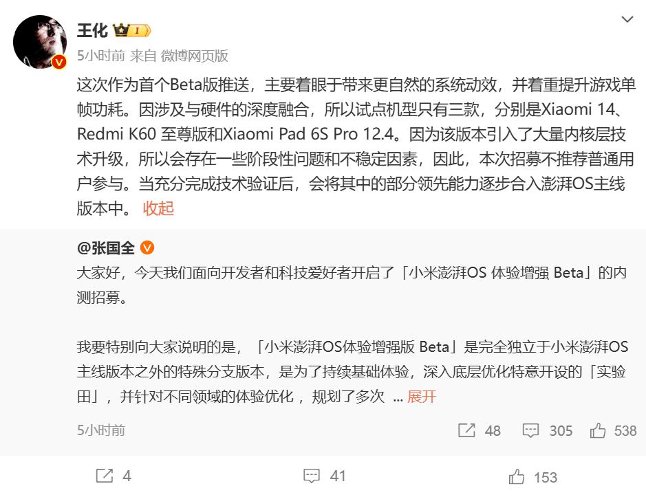 小米澎湃OS体验增强版Beta将引入多项内核层面的新技术,以期提升用户的使用体验。小米公关部总经理王化在微博上透露,首次更新将专注于系统动效的自然流畅性,同时也会着重优化游戏过程中的单帧功耗。
