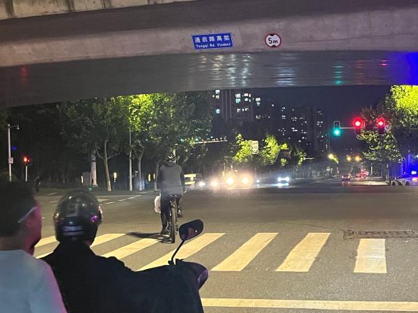 5月10日晚,发生事故的十字路口,事发时大巴车沿盘香路自北向南行驶方向的信号灯已显示正常。澎湃新闻记者 郑鸣之 图