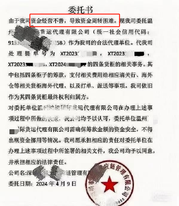 跨境玩家都知道,货代公司作为跨境电商的重要支撑,其运营状况直接关系到跨境贸易的顺利与否,但偏偏货代行业爆雷事件频发,打得卖家措手不及。前阵子,深圳一个货代公司发布了一份委托书文件,表示公司资金经营不善导致资金周转困难,于是委托了温州的另一家货代公司作为代理单位,代替其处理四条货柜的相关事务。