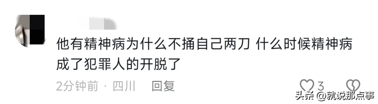 网友说:“ 他有精神病为什么不捅自己两刀 什么时候精神病成了犯罪人的开脱了!”