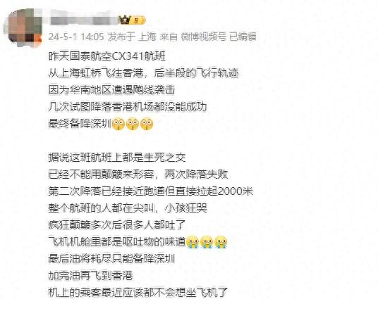5月1日,有网友发帖称,4月30日,从上海虹桥飞往香港的国泰航空CX341航班,几次试图降落香港机场未能成功,最终备降深圳。