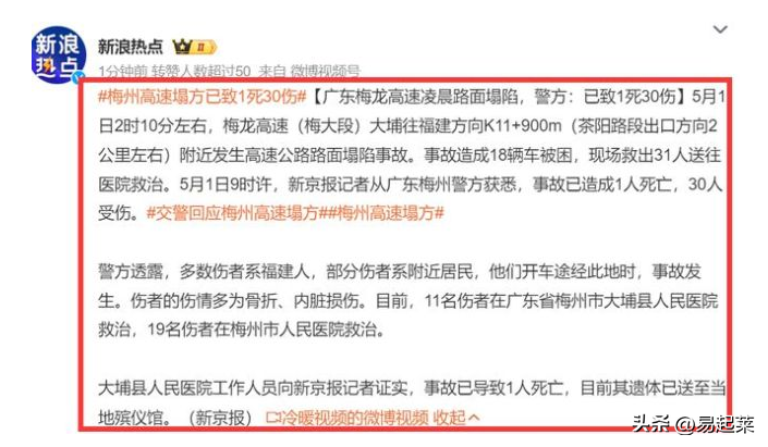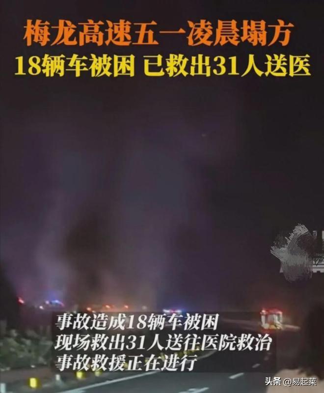 5月1日凌晨大约2点10分,广东省境内的一段高速公路发生了严重的路面塌陷事故,导致18辆汽车受困。救援行动迅速展开共救出31名被困人员并送往医院,遗憾的是,其中1人最终因伤势过重而不幸离世,遗体已被送往殡仪馆妥善安置。