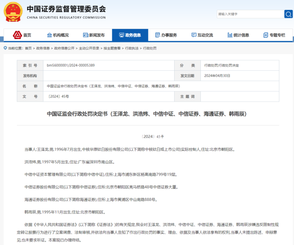 证监会官网近日公布的行政处罚决定书显示,因违反限制性规定转让中核钛白(002145 SZ)2023年非公开发行股票、信息披露违法等违法违规行为,中核钛白实控人王泽龙及朋友洪浩炜、中核钛白原董秘韩雨辰、中信证券、海通证券及中信中证合计被罚没2.35亿元,其中王泽龙被罚没1.33亿元。