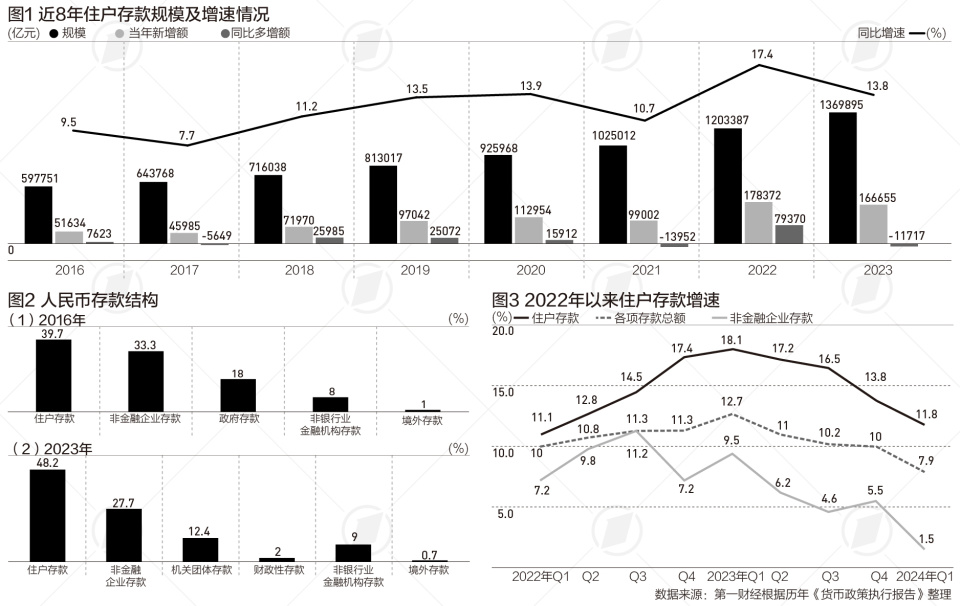 《一季度货币报告》称,在经济循环的过程中,银行如果还在扩张资产、贷款仍在增加,钱不会从实体经济中减少,也不会消失,只是随着企业投资生产、居民消费、财政收支,存款在企业、居民、政府等部门间会有转移。2024年3月末,在约296万亿元的存款总盘子中,居民、企业、政府各占49%、27%、14%,分别较疫情前的2019年上升7.1个、下降4.2个、下降3.3个百分点。