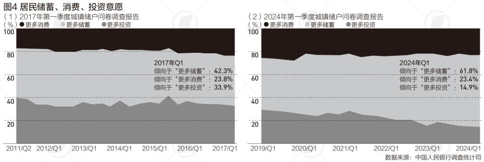 第一财经梳理央行历年每季度发布的《城镇储户问卷调查报告》发现,居民储蓄意愿不断上升,投资意愿逐渐下降。2017年第一季度选择“更多储蓄”“更多消费”和“更多投资”的居民占比分别为42.3%、23.8%和33.9%;2024年第一季度“更多储蓄”上升19.5个百分点至61.8%,“更多消费”下降0.4个百分点至23.4%,“更多投资”下降19个百分点至14.9%。