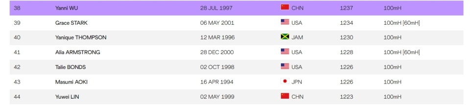吴艳妮以1237积分排在世界第38位,另一名中国选手林雨薇积分1223排名第44位,她们也是唯二进入该项目世界前100的中国选手。