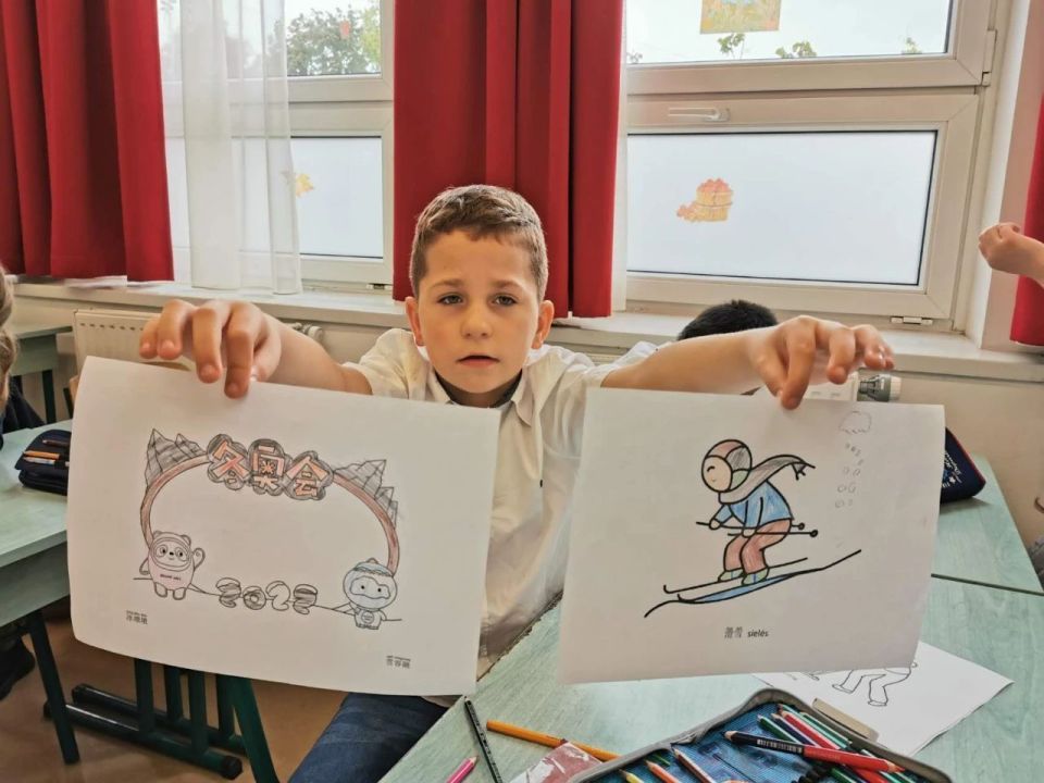 △匈中双语学校学生展示具有冬奥元素的填图画?。
