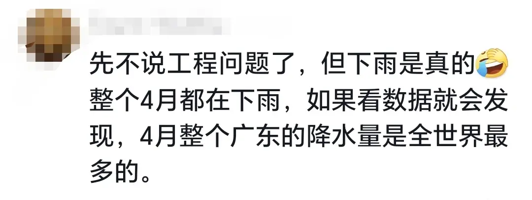 广东四月份下了整整一个月的雨,全世界降雨最多的地方。一些网友认为,此次塌方主要原因也是降雨,导致的路基滑坡。