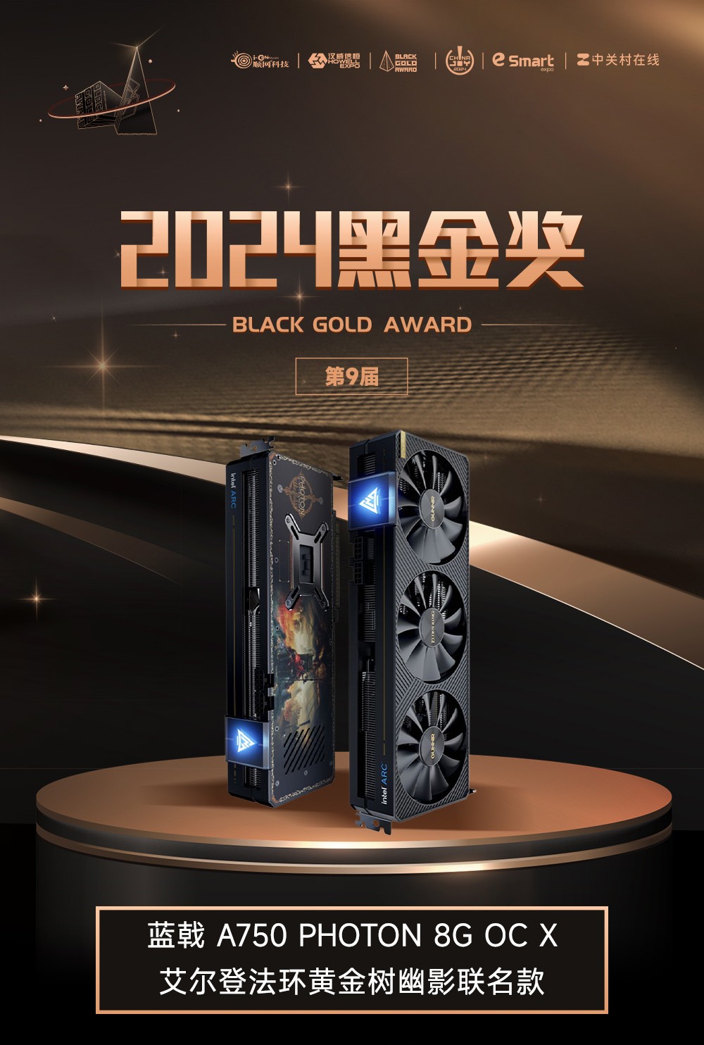 2024年7月27日,第九届ChinaJoy黑金奖(BlackGold AWARD)正式揭晓。蓝戟A750 PHOTON 8G OC艾尔登法环黄金树幽影联名款显卡凭借着优秀的设计、极致的性能,荣获2024年度黑金奖。