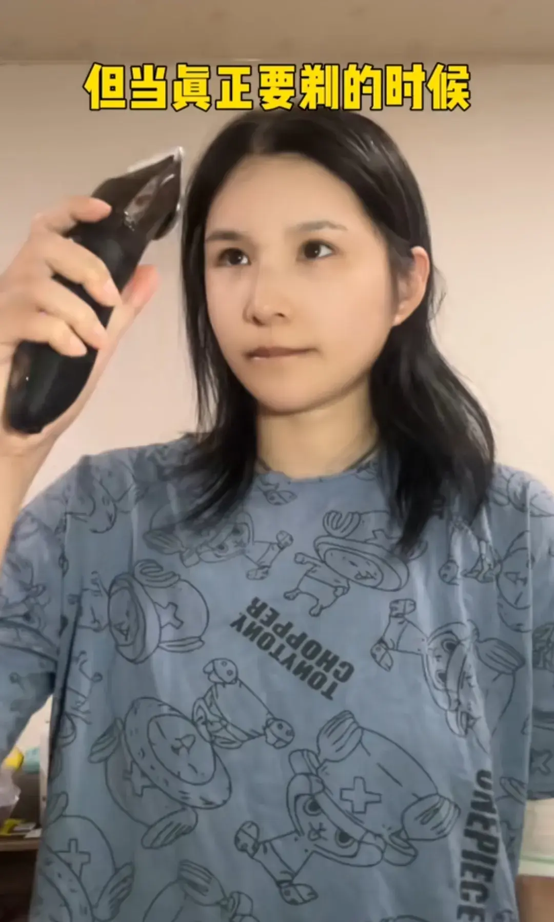 女人坐在镜子前万分不舍,她对着男人喊了声:“老公,你帮我剃了!”