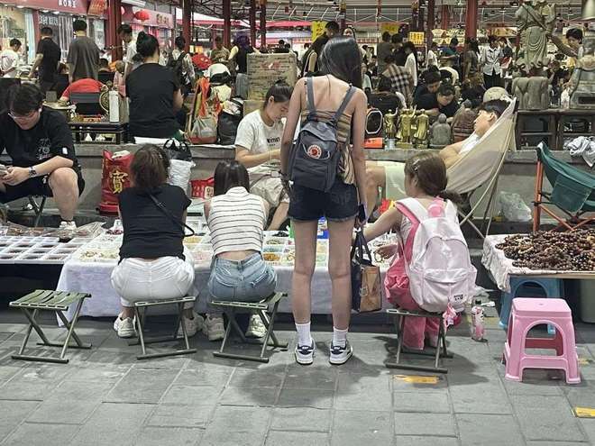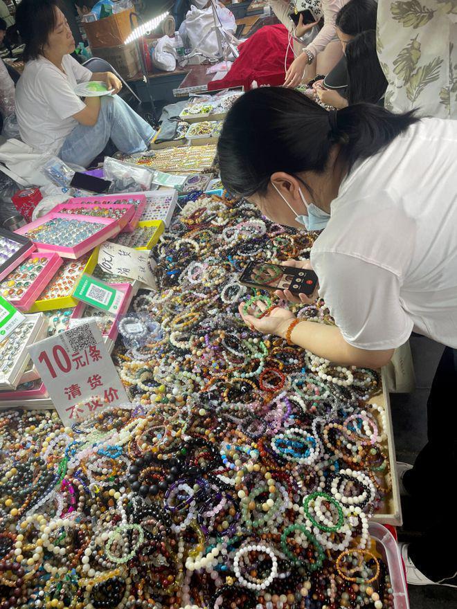 一块钱一粒的玛瑙、玻璃珠子,光是把手伸进去就有种解压感,就像在超市将手伸进冰凉的米堆里。挑染头发、穿着辣妹装的姐妹,和背着电脑包、戴眼镜的男生,一人一个小马扎,围坐在一起,打开手机照明,沉浸式选珠子,专注的神情堪比做化学实验。