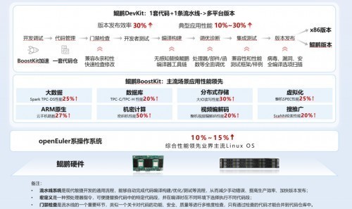 其中,鲲鹏开发套件DevKit能够提供覆盖迁移、开发、调试、编译、测试、调优&诊断等全研发作业流程的能力,并支持以命令行方式快速集成到企业自有CI/CD流水线,开发者可以在流水线中直接调用鲲鹏DevKit插件能力,包括:鲲鹏兼容性&亲和性门禁检查、无感知切换鲲鹏高性能编译软件(毕昇编译器、毕昇JDK、GCC for openEuler)、鲲鹏性能分析插件、鲲鹏测试框架&样例、版本安全合规扫描等,实现1套代码(门禁检查自动对代码兼容性检查并辅助修改,有架构差异的代码使用宏定义隔离)+1条流水线(现有流水线上增加鲲鹏构建流程),鲲鹏和x86两个版本同步迭代,平均发布效率提升30%+。