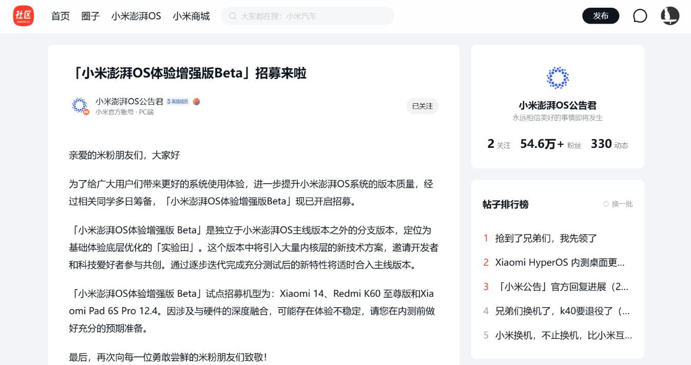 在今日的小米社区公告中,小米官方宣布了澎湃OS体验增强版Beta的招募计划。这一新版本是小米澎湃OS主线版本之外的一个分支,旨在作为基础体验优化的试验平台。