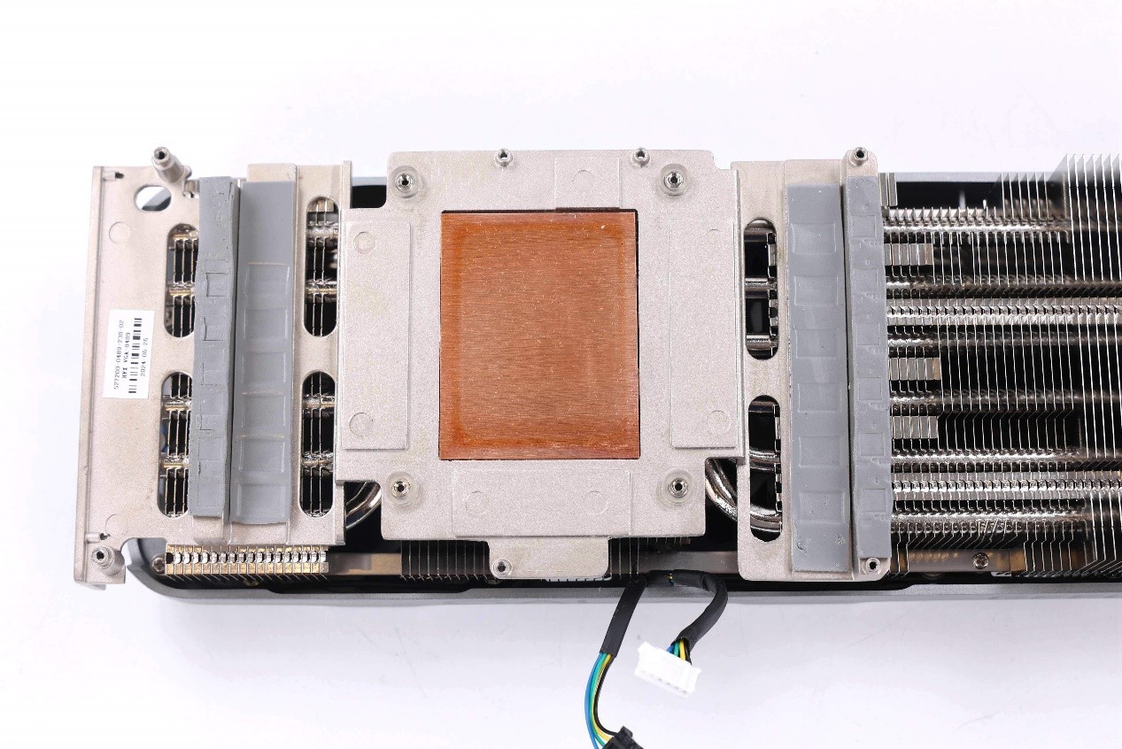依次卸下显卡螺丝,将PCB拆下,可以看到寒光星散热器上的显存/供电一体压铸件散热模块,通过将金属挡板-Base-金属背板三重联锁的设计,将显卡通过压铸件与机箱固定,由压铸件承重,能够大大减少PCB因受散热器重力而弯曲的情况。