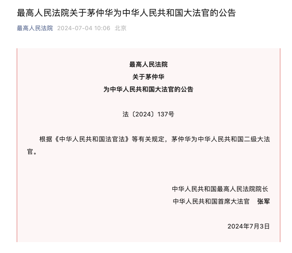 转载:https://new.qq.com/rain/a/20240704A0265C00 2024-07-04 10:11·成都商报红星新闻·发布于四川 最高人民法院关于茅仲华为中华人民共和国大法官的公告法〔2024〕137号根据《中华人民共和国法官法》等有关规定,茅仲华为中华人民共和国二级大法官。中华人民共和国最高人民法院院长 中华人民共和国首席大法官 张军2024年7月3日来源:最高人民法院