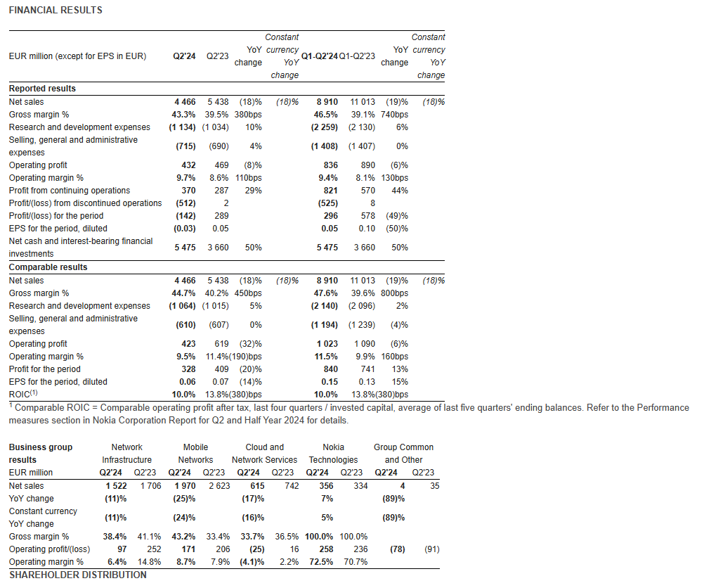 根据最新的业绩报告,诺基亚在2024年第二季度和上半年的净销售额同比下降了18%,达到44.7亿欧元(相当于355.1亿元人民币)。此外,可比毛利率同比增长了450个基点,达到44.7%,而可比营业利润率则同比下降了190个基点,降至9.5%。