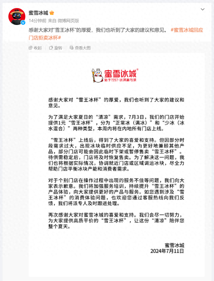 “雪王冰杯”上线后,得到了大家的喜爱和支持。但因部分时段需求过大,出现冰块临时供应不足,为更好地兼顾其他产品,部分门店可能会因此临时下架或暂停售卖“雪王冰杯”。待供需稳定后,门店将及时恢复售卖。为了解决这一问题,我们也将根据实际情况,协调就近门店或区域调运冰块,尽全力帮助门店平衡冰块产能和消费者需求。