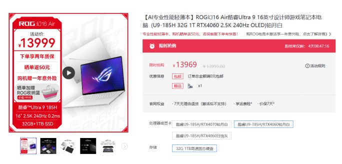 第二款要推荐的则是ROG幻14 Air,作为一款面向专业人士及学生群体的高性能轻薄本,幻14 Air搭载了最新一代AMD锐龙9 8945HS处理器和配备了NVIDIA GeForce RTX 4060独立显卡的产品,搭配上32GB内存和1TB固态,规格十分强悍。目前,其售价为12969元,并赠送AMD联名电动牙刷,同时下单可享两年质保、一年意外险,加赠ROG收纳篮,晒单还返50元等诸多福利。