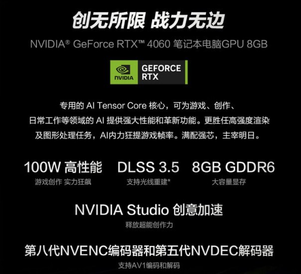 显卡则使用了RTX 4060笔记本电脑GPU,全面支持DLSS 3.5技术,以及在AI Tensor Core的加持下,令游戏和生活更加具有效率,当然,无论是视频剪辑、图像处理还是娱乐学习,都能游刃有余。