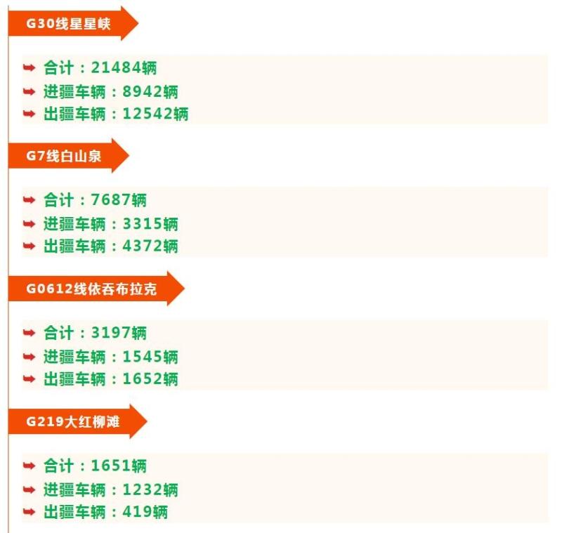 5月1日,进出疆通道交通通行总流量34019辆,同比下降3%;其中客车交通总量11948辆,同比上升6.9%,货车交通总量22071辆,同比下降7.8%。